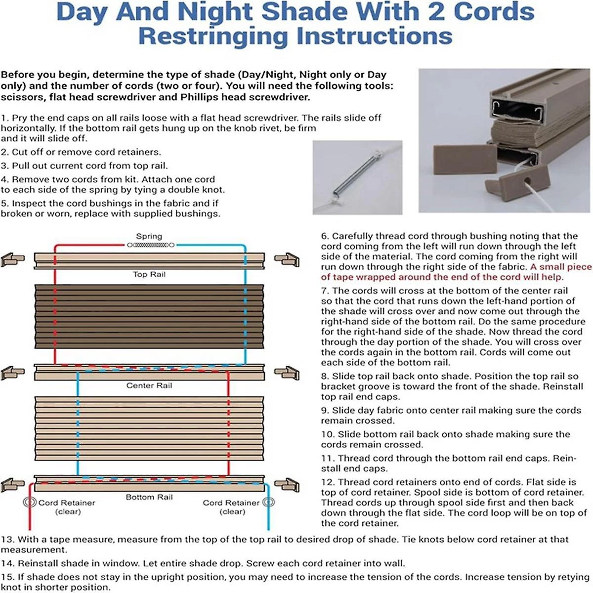 This kit includes the essentials needed to restring or repair your day, night, or night and day pleated shades of either the two cord or four cord . In a few minutes, you can fix your shades and extend the life instead of entirely switching them.