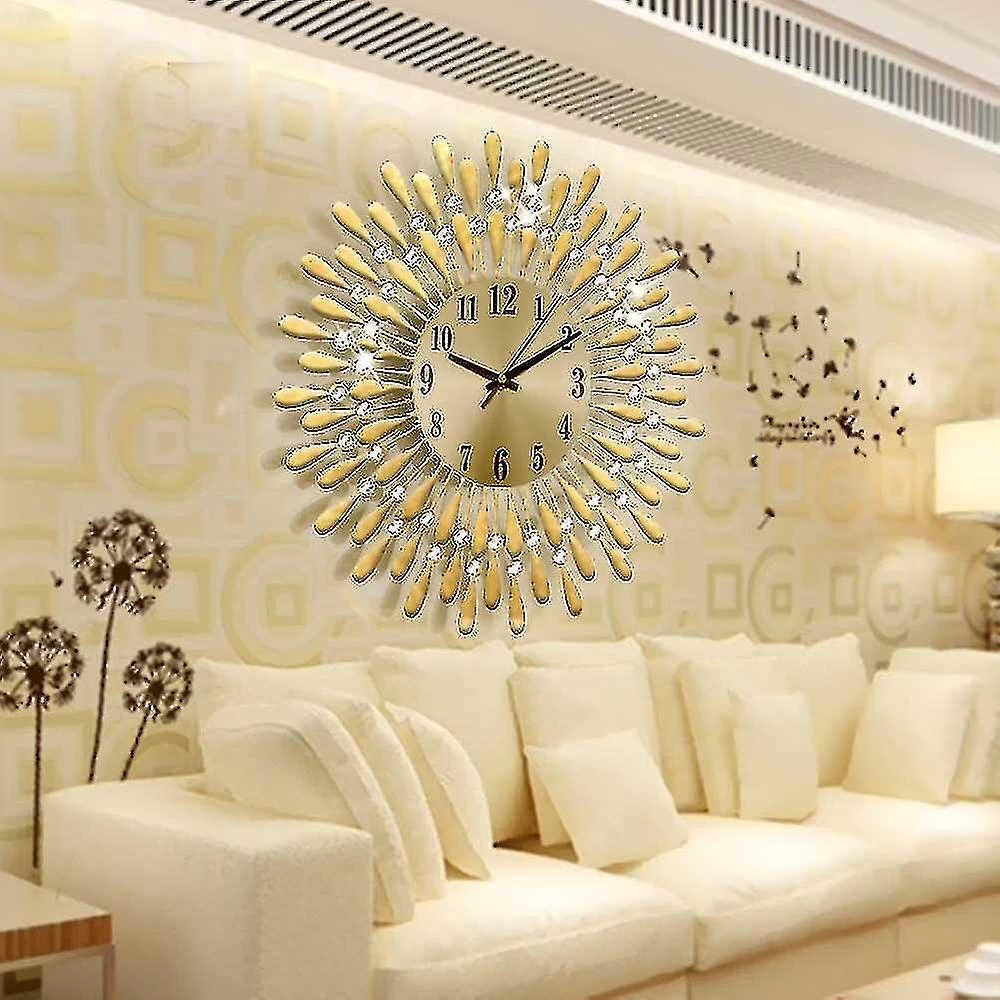 specifications:size: about 37.5Cm in diametermaterial: iron art + glass + flash diamondcolor: black, goldprocess: high temperature baking varnish, no fading, no deformationmovement: silent movementera: 21st century 2000-now type: wall clockfinish: blackroom: any roomfeatures: 12 hour displaydisplay type: analoguetheme: sun ray stylepower source: battery poweredstyle: retro stylepower source:1x aa battery powered battery is not included wall mounted display: sunflower wall clocktheme:sun ray stylegold modernist face: sunflower wall clockoriginal/reproduction:originalmid century furniture:replacement quartz movementmodification new quartz movement and handsshape:roundmodel:noclock type:wall clockquantity: 1 pcera: moderninclude:1x 38cm large wall clock arab numerals metal indoor big round open face garden uk